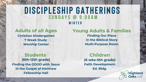 Join us at 9am every Sunday for a chance to grow and connect with our Discipleship Gatherings.